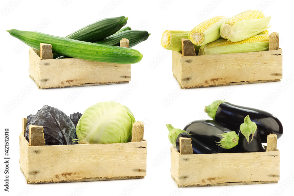 Fresh cooking vegetables in a wooden crate on a white background