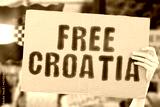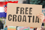 The phrase " Free Croatia " on a banner in men's hand with blurred Croatian flag on the background. Protest. Riot. Violence. Economic crisis. Collapse. Politics. Streets. Save. Cruelty