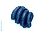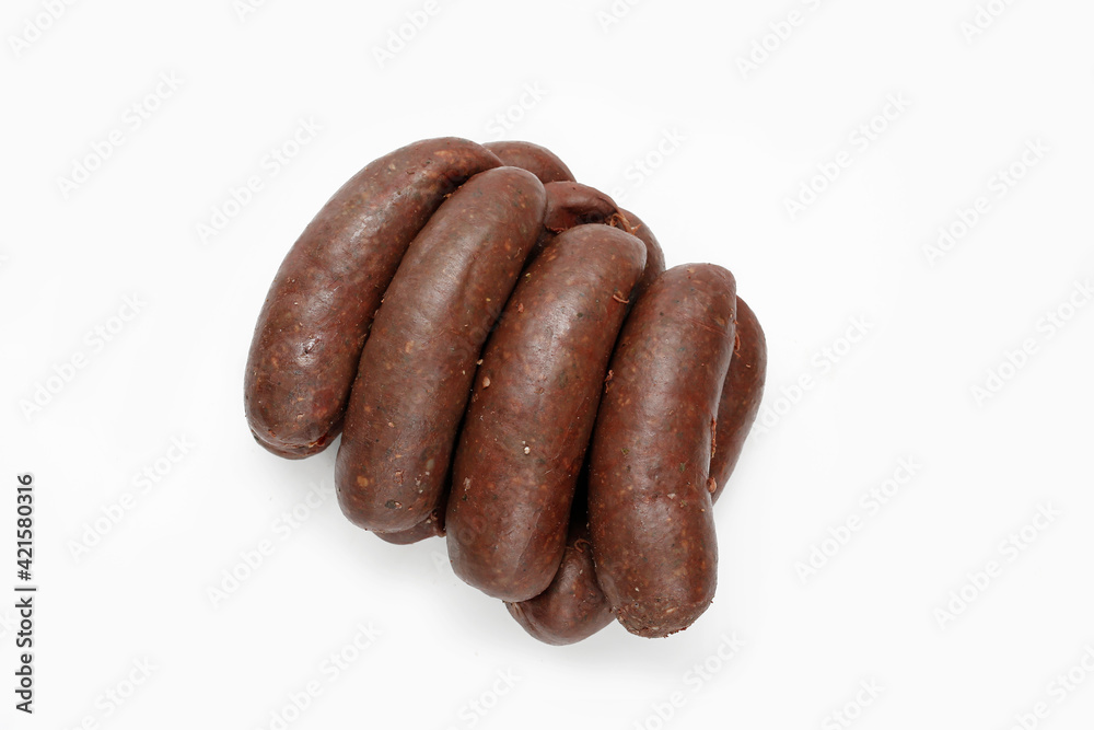 Top view of blood sausage, black pudding, isolated on a white background. Traditional meat sausage, a packshot photo for package design, template. Polish kaszanka, kiszka sausage.