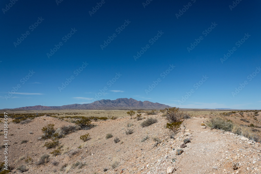 Deserted path in the New Mexico desert with an expansive view of mountain ridges under deep blue sky, Sevilleta, horizontal aspect