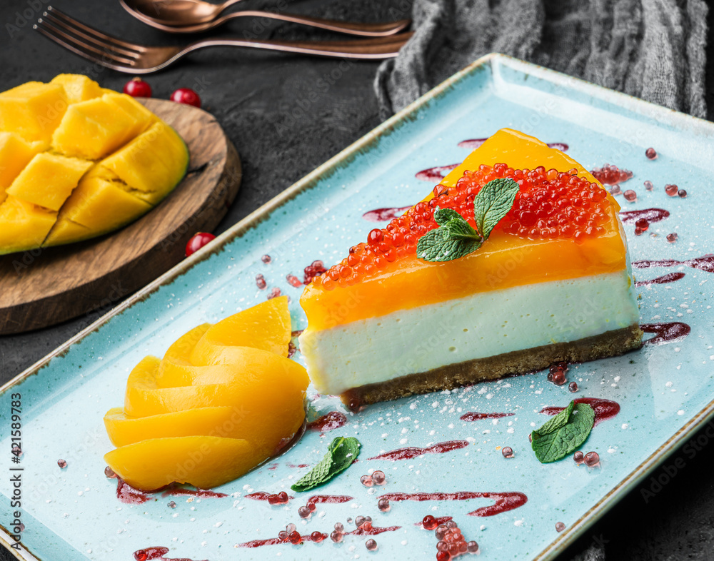 Creamy mango cheesecake decorated with red berries and mint on a large plate and dark background, close up view. Summer desserts and sweets
