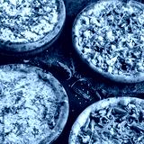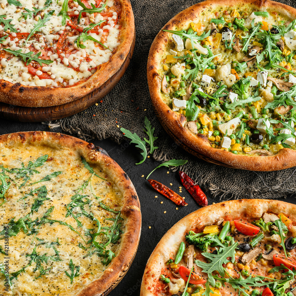 Variety of vegetarian pizzas with cheese, greens, vegetables on wooden board over black background. Fast food lunch, gathering, celebration, top view