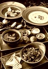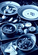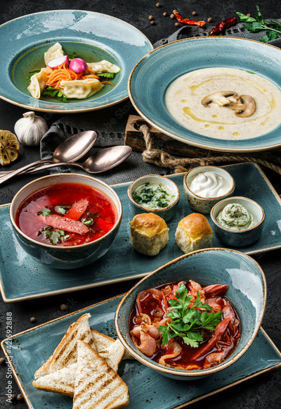 Various soups from worldwide cuisines, Russian traditional beetroot soup with meat, mushrooms cream soup, and dumpling soup on dark background served with croutons, top view