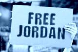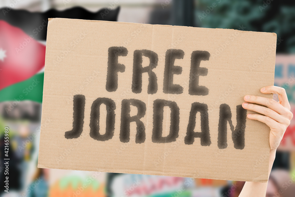 The phrase " Free Jordan " on a banner in men's hand with blurred Jordanian flag on the background. Protest. Riot. Violence. Economic crisis. Collapse. Politics. Streets. Save. Cruelty