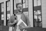 Smiling university student with backpack and book walking in university campus, education concept. Portrait of happy handsome man wearing stylish eyeglasses looking away on the street, copy space