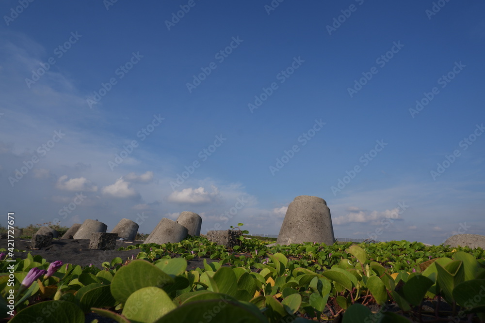 low view of beach with bayhops plants on the ground