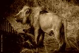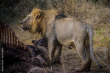 Male lion, panthera leo, eating on giraffe carcass in savannah in South Africa