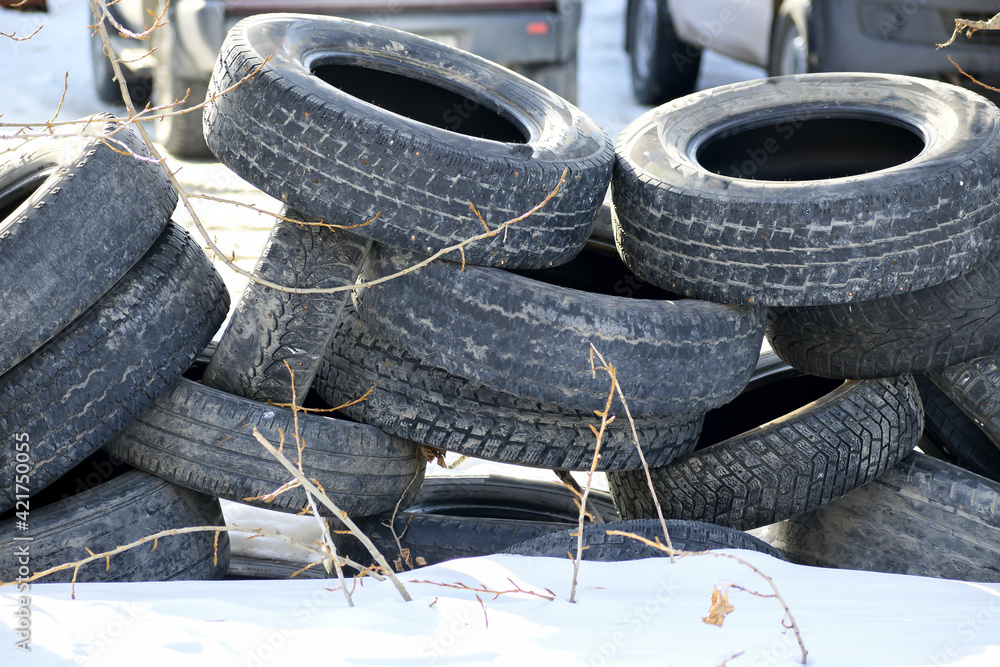 A pile of old tires lies on the snow-covered ground