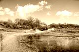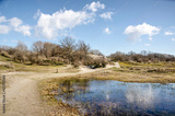 Sandy hiking trail along a pond on a sunny day in the dunes near Rockanje on the island of Voorne, The Netherlands in early spring