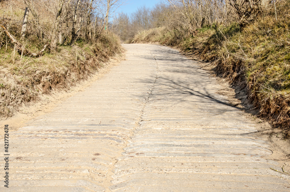 Rough concrete path leading into the dunes from Quackstrand beach near Hellevoetsluis on the island of Voorne, The Netherlands in early spring