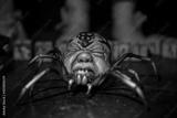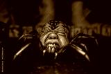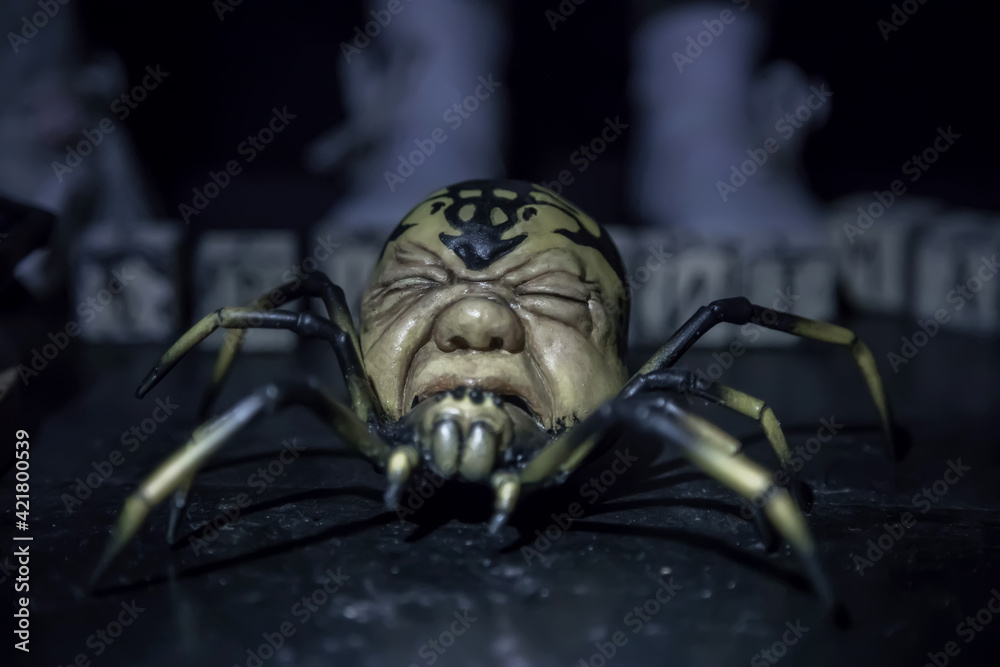 Spider monster with a human head. Scary dead doll.