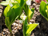 (Convallaria majalis) Lily of the valley or may bells, white pendent flowers with fused petals in form of bell-shaped on upright stems apex with two green leaves