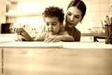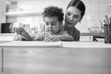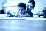 Mother looking at his son creation while spending time with him at home