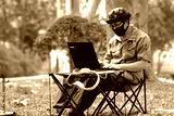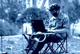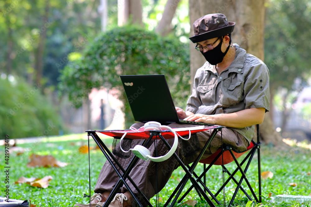 Man using laptop computer in garden background and relaxing on holiday