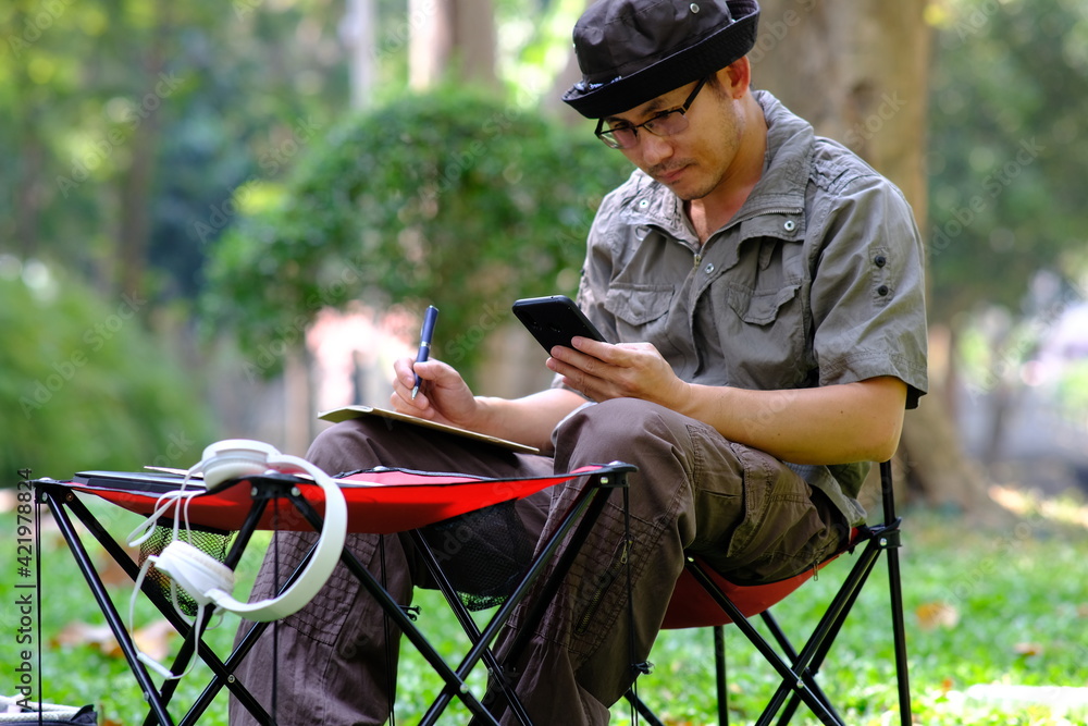 man using smartphone in garden background and business concept