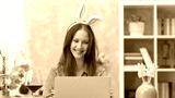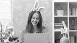 Happy woman talking and waving on video chat at home. Celebrating Easter online wearing bunny ears using laptop for video call.