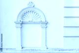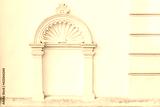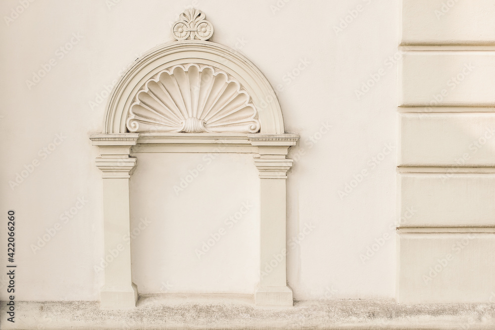 Decorative arch and semi vault above niche with classic pillars. Architectural stucco detail of old European buildingin Prague. Elegant masonry facade decor in beige color. No people, front view.