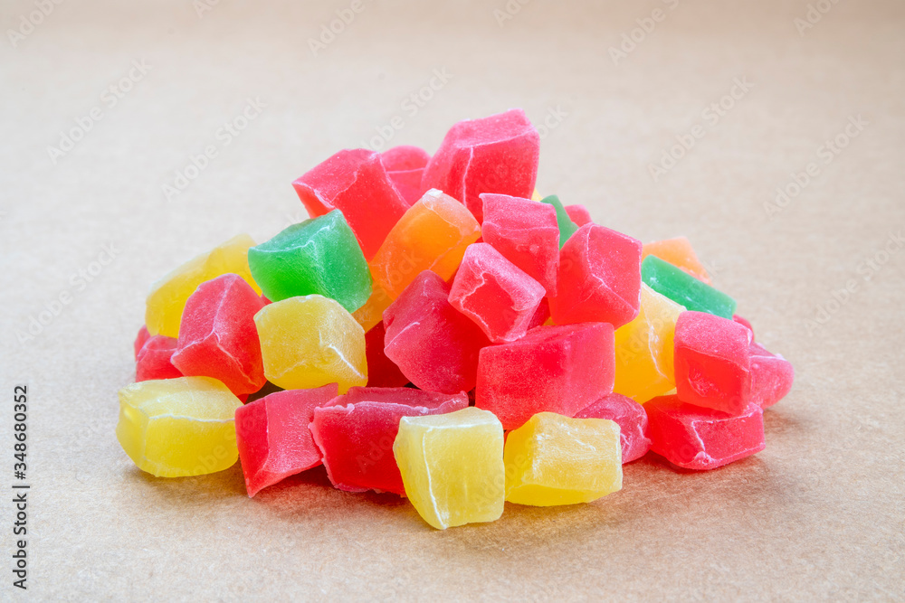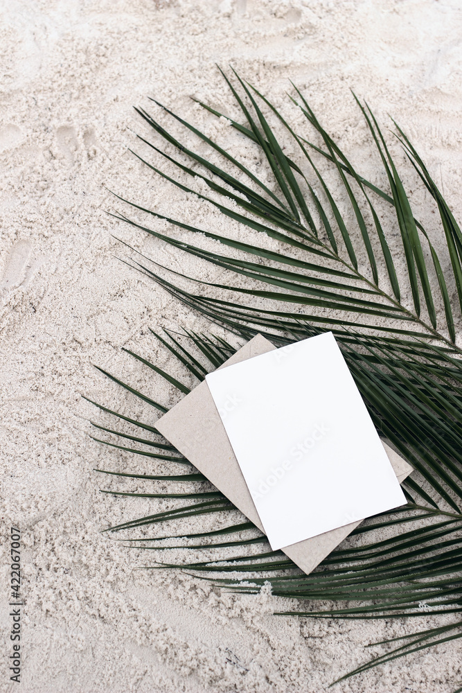 Tropical summer stationery still life. Empty greeting card mock-up, craft envelope on green date palm leaves. Sandy beach background, desert. Flat lay, top view. Exotic island vacation, travel concept