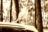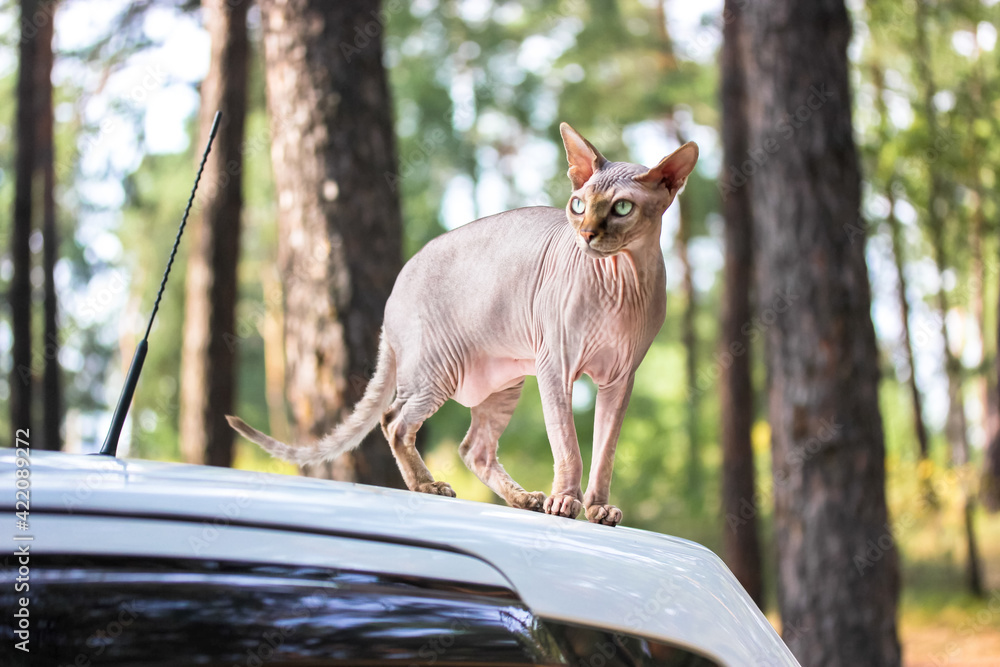 A gray Canadian Sphynx cat in the green pine forest in warm sunny day. Portrait of a beautiful bald cat with green eyes, staying on top of the white car. A domestic cat on a walk outside.