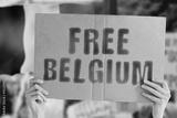 The phrase " Free Belgium " on a banner in men's hand with blurred Belgian flag on the background. Protest. Riot. Violence. Economic crisis. Collapse. Politics. Streets. Save. Cruelty