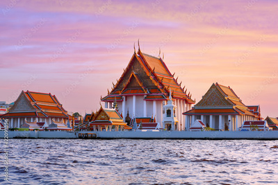 View of the Buddhist temple Wat Kalayanamit Woramahawihan by the Chao Phraya River in the evening. Bangkok, Thailand
