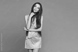 Cute model girl with perfect body in a short beige dress posing on the beige background, studio shot with copy space on both sides