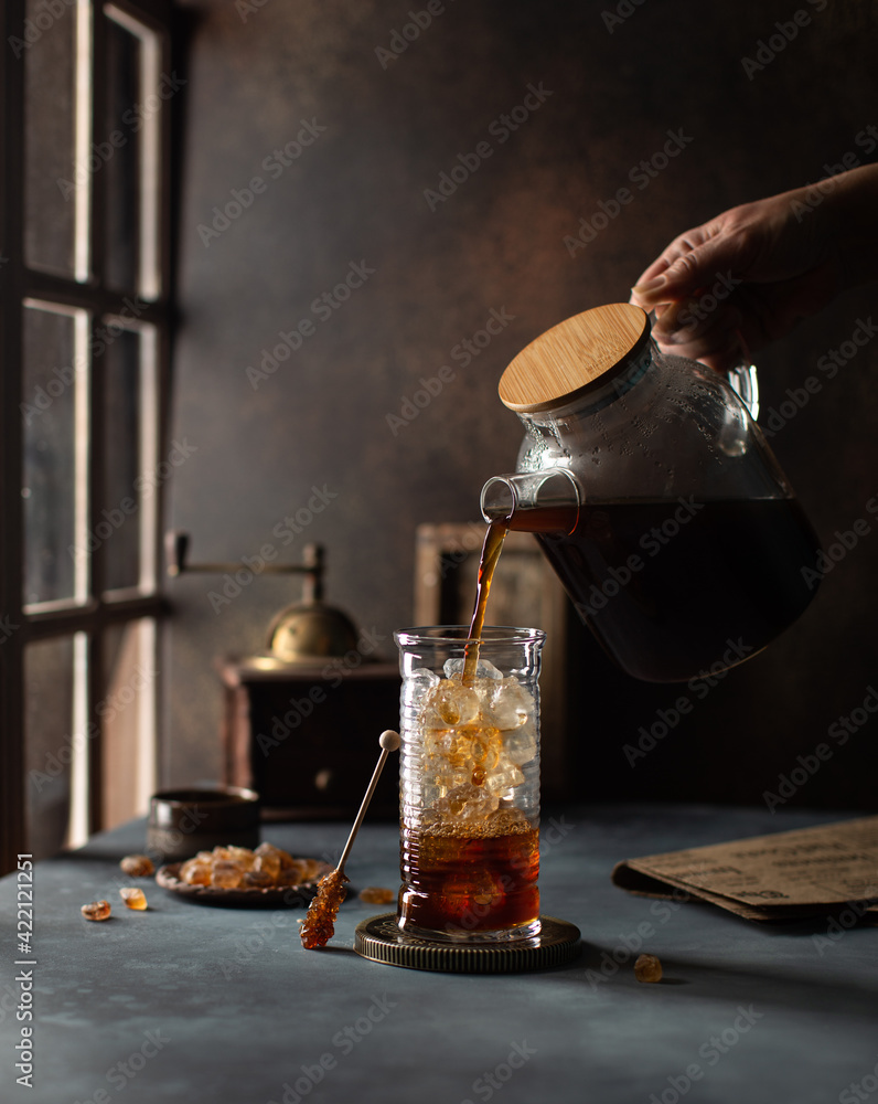 Women's hand pours coffee in to the glass with ice,with bouquet of flowers and vintage coffeegrinder on the table near the wooden window.Still life with a drink on the kitchen.