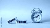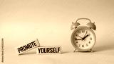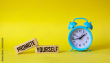 Promote Yourself text written on wooden blocks and yellow background with alarm clock