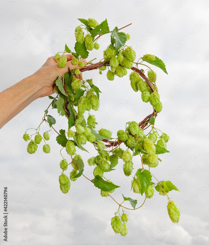 Hopfenkranz in einer Hand vor hellem Hintergrund