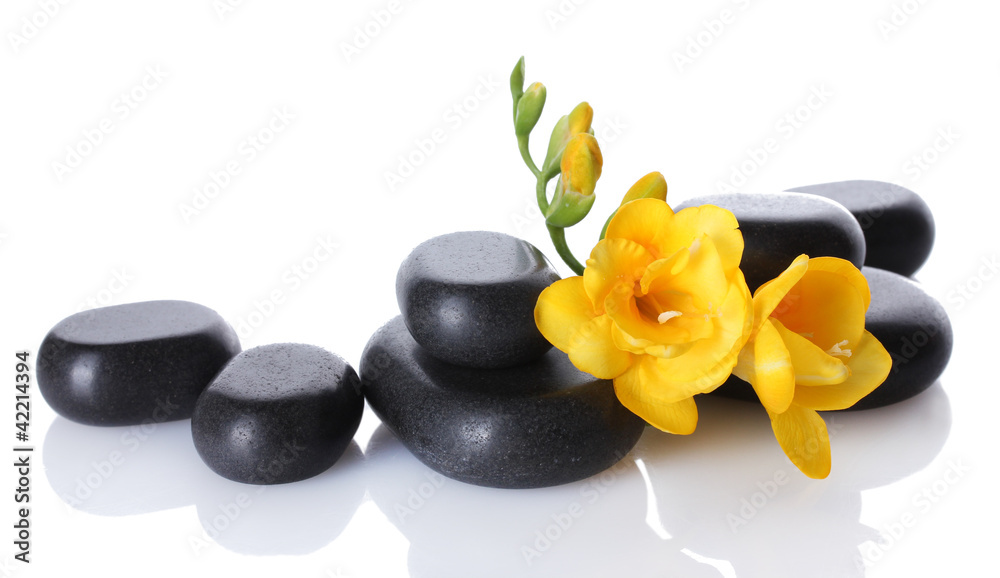 Spa stones and yellow flower isolated on white