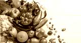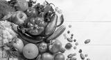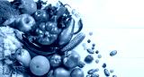 Organic healthy food background. Food photography different fruits and vegetables on white wooden table background. Top view