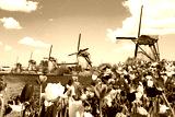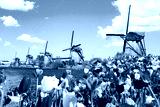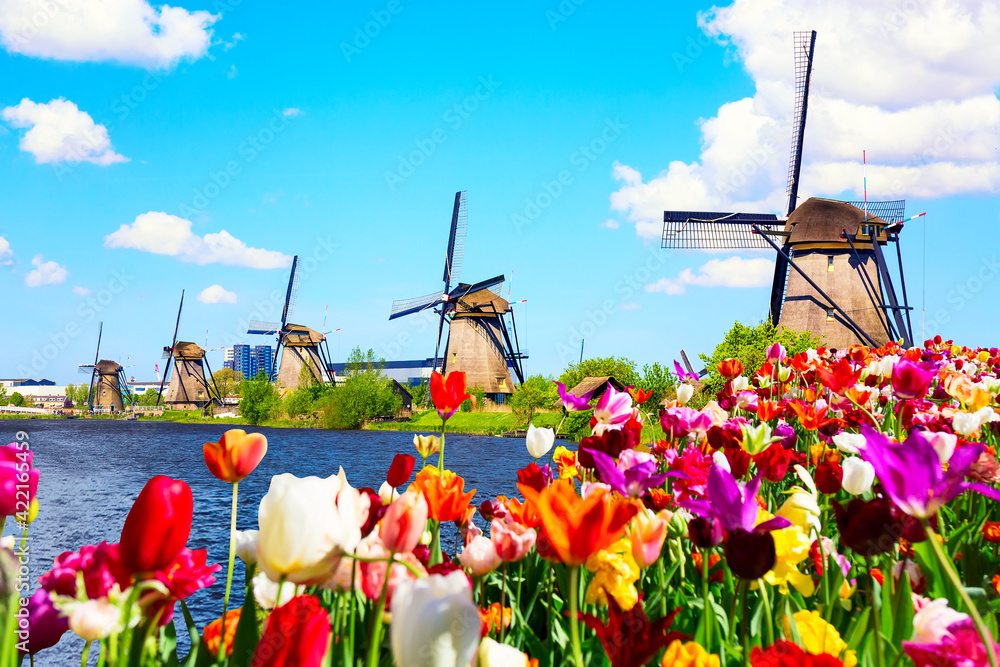 Beautiful colorful spring landscape in Netherlands, Europe. Famous windmills in Kinderdijk village with tulips flowers flowerbed in Holland. Famous tourist attraction in Holland