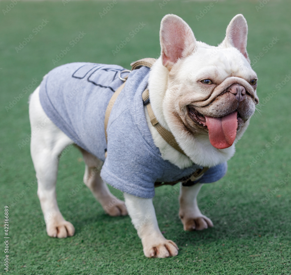 2-Year-Old Platinum Male Frenchie Standing with Tongue Out. Off-leash dog park in Northern California.