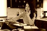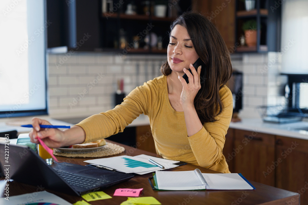 Young smiling business woman working from home sitting in front of laptop computer at home kitchen
