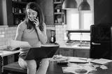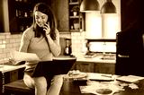 Young smiling businesswoman working from home using a laptop computer and smartphone sitting on a kitchen bench