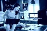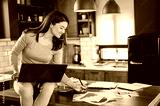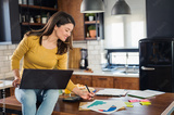 Young smiling business woman working from home, sitting at home kitchen with computer on her lap