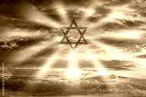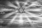 Judaism logo on sky background. Star of David as a symbol of Jewish religion. Symbol of Judaism religion. Jewish religion. Concept - visits to Jewish Senagogue. Star of David emits rays of light.