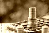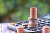 Stacks of gold money coin on table background and concept saving money, business growth strategy of money concept, advertising coins of finance and banking