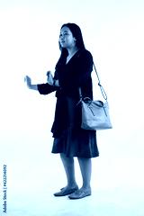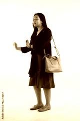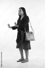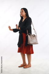 Young woman in casual outfit with stylish bag on white background.