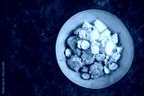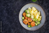 Steamed fish fillet with tomatoes sauce, boiled potatoes and fresh cucumber salad. Diet meal. Lenten food. Top view, above