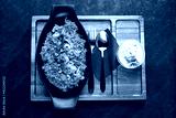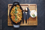 Biryani, on a black stony background, top view. Traditional Indian cuisine. An orintal, baked dish made of basmati rice, vegetables, meat, herbs, nuts, served with yoghurt sauce.