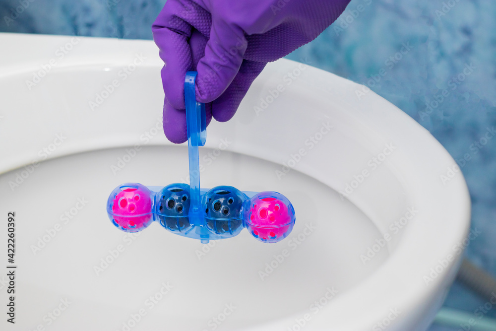 Person in purple protective rubber gloves holds multi-colored balls of toilet bowl cleaner. Selective focus, close-up.