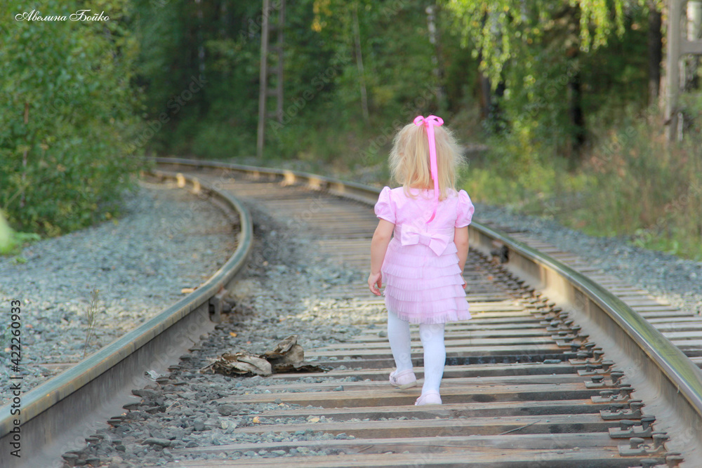 The child walking on the railway. A small girl walk on the railway a zone of increased danger