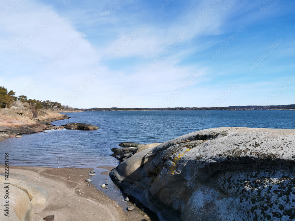 Beautiful shot of the sea against the blue sky captured from the beach in Naustholmen, Norway