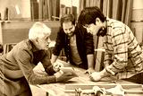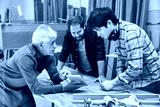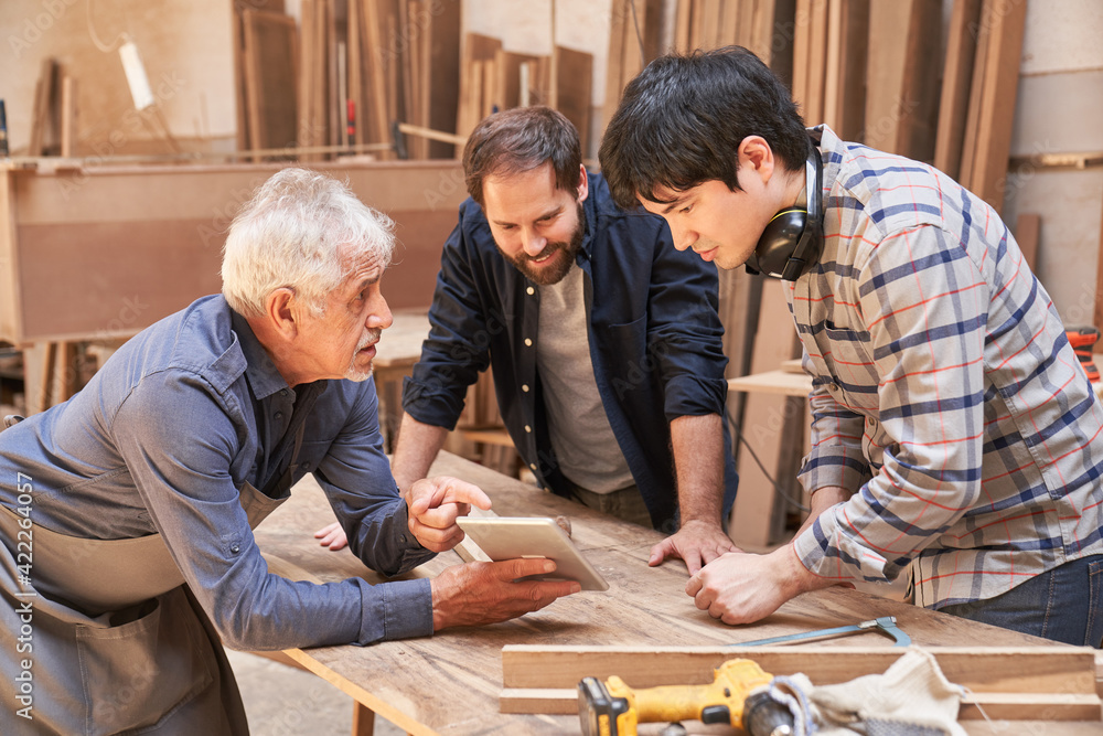 Ausbilder lehrt Schreiner Lehrlinge in der Tischlerei