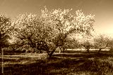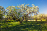 Splendid ornamental garden with blooming lush trees on a sunny day.