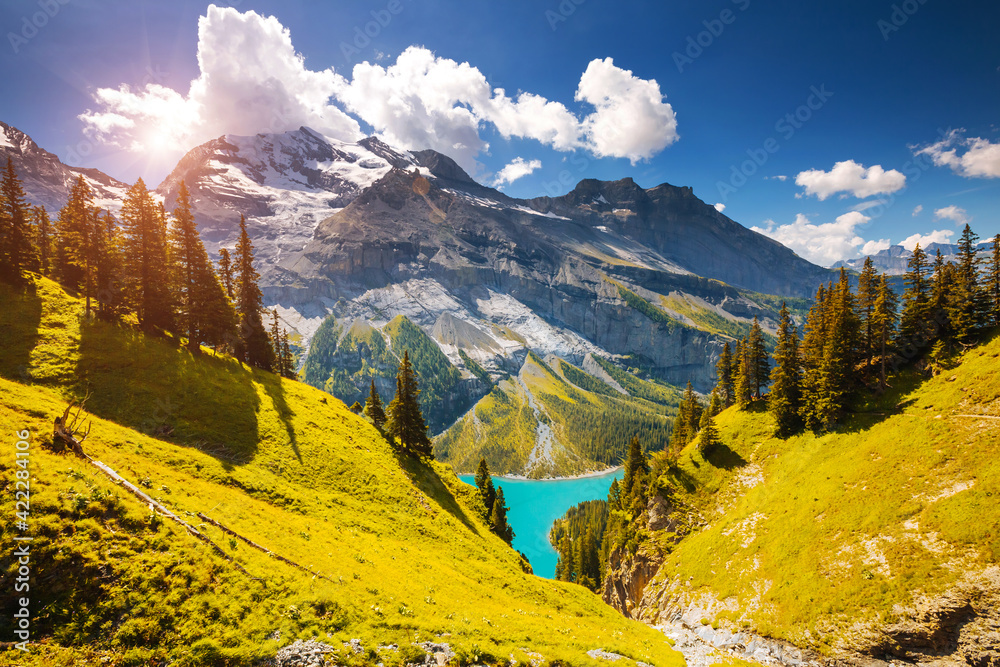 Spectacular view of the lake Oeschinensee in sunny day. Location place Swiss alps, Kandersteg district, Europe.