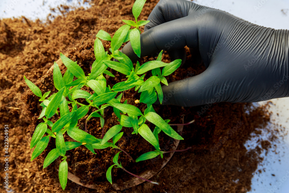 Transplanting seedlings. Transplanting young pepper seedlings for further growth.
