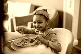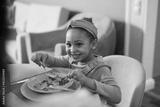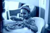 Portrait of cute African-American girl eating food at table and smiling happily while enjoying dinner with family