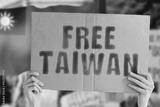 The phrase " Free Taiwan " on a banner in men's hand with blurred Taiwanese flag on the background. Protest. Riot. Violence. Economic crisis. Collapse. Politics. Streets. Save. Cruelty